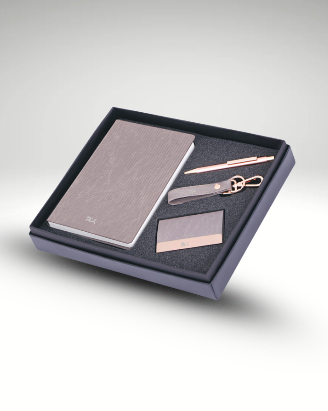 The Executive Quad Set includes a PU leather diary, sleek metal pen, stainless steel cardholder, and elegant leather key ring, combining professionalism and practicality for corporate gifting.