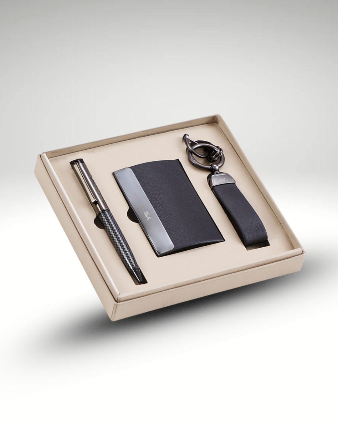 The Professional Set includes a sleek pen, premium cardholder, and stylish keychain, combining elegance and utility for corporate gifting.
